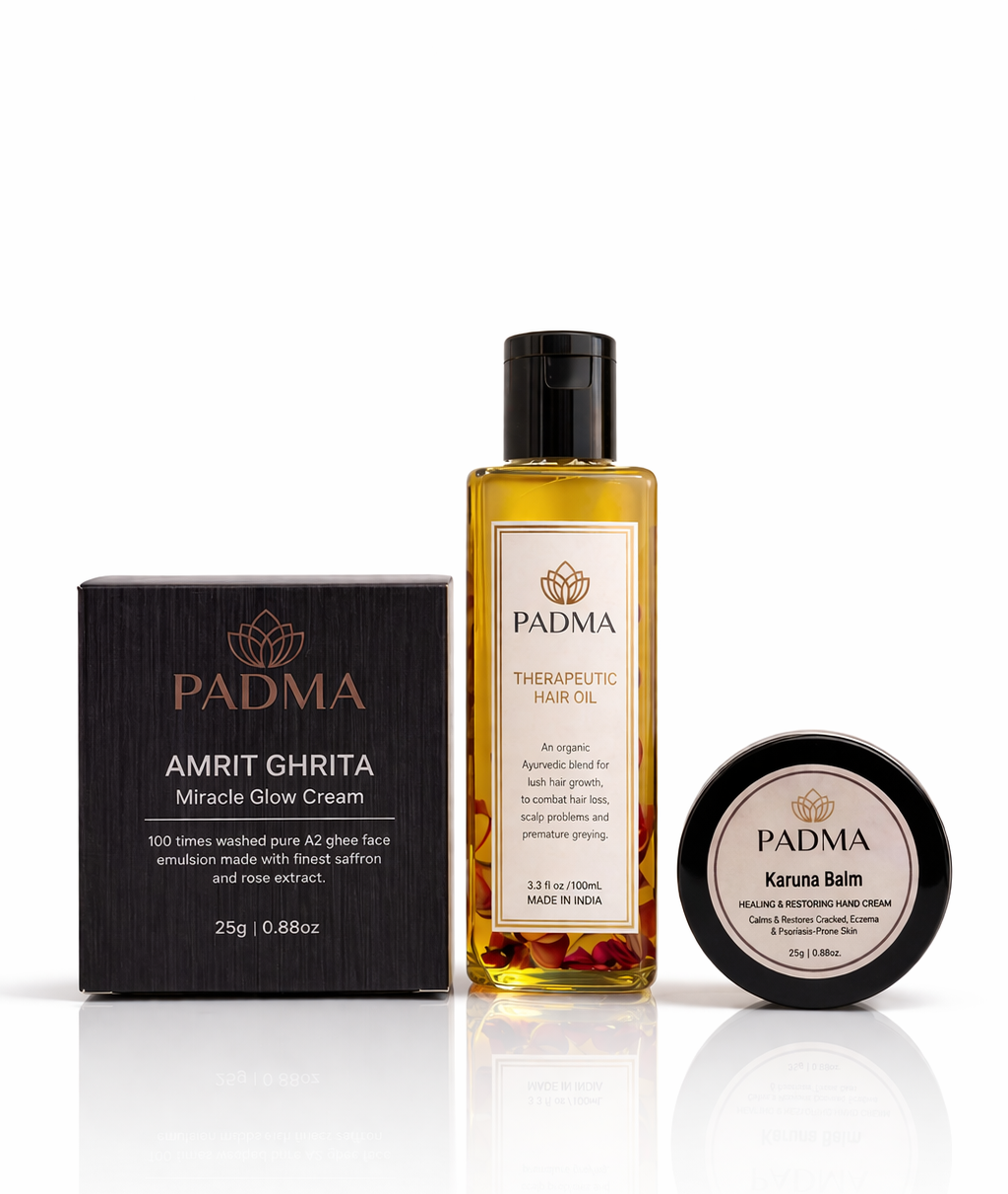 Padma’s Head-to-Toe Ritual Set is your all-in-one Ayurvedic care bundle—designed to bring balance, softness, and vitality to your hair, skin, and hands. Crafted with traditional healing ingredients and no harsh chemicals, this trio delivers powerful nourishment and lasting comfort for everyday rituals.