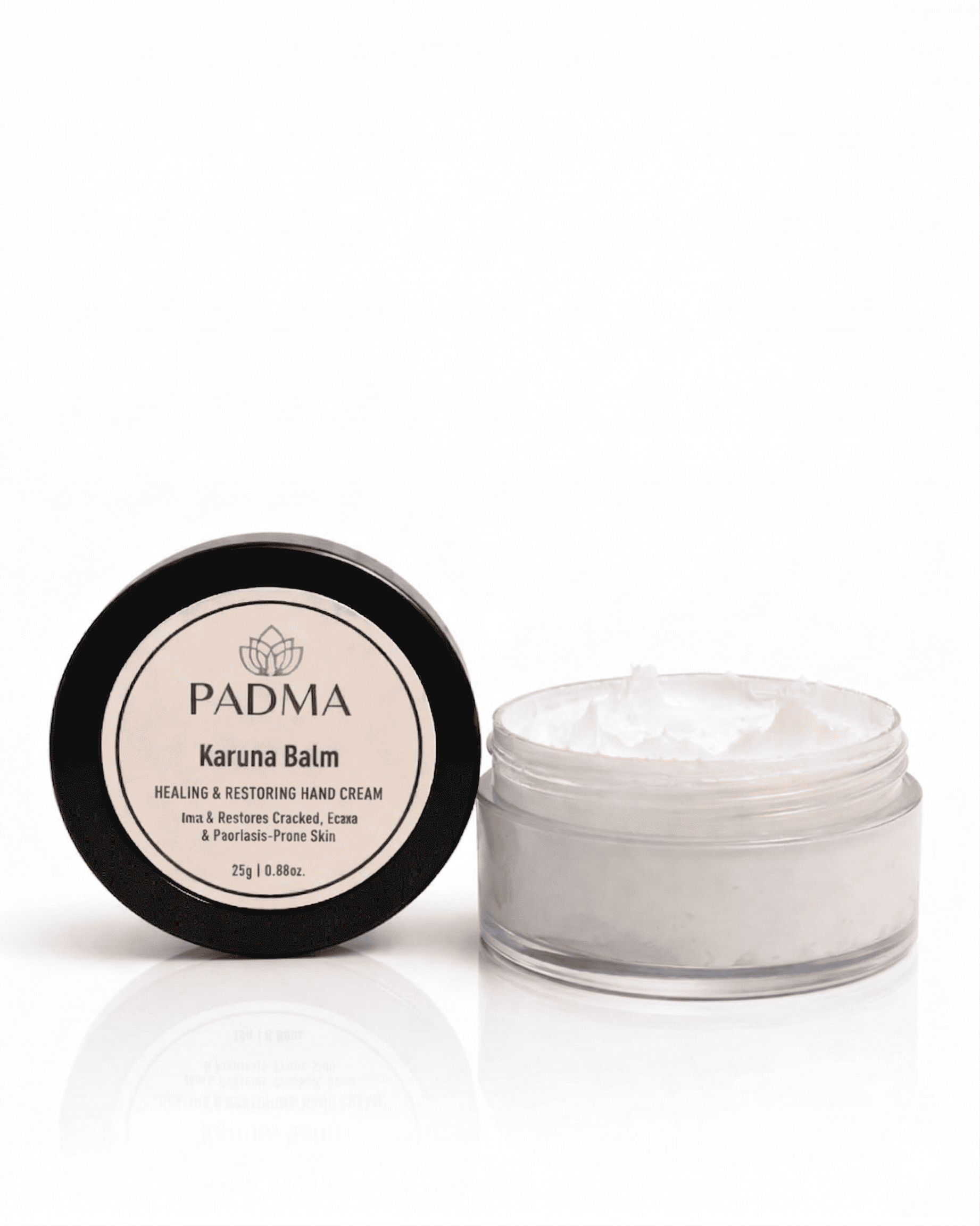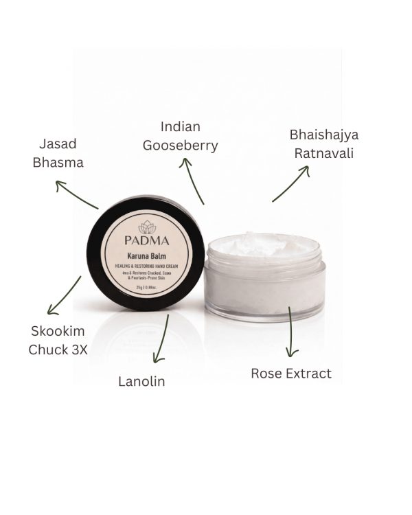 A deeply restorative balm designed to soothe cracked, dry, and sensitive hands. Inspired by Ayurvedic texts and enhanced with therapeutic minerals, Karuna Balm helps calm irritation, reduce flare-ups, and support skin healing—especially for those with eczema or psoriasis-prone skin. Its rich, protective base locks in moisture and provides lasting relief without feeling greasy.