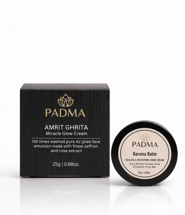 -Amrit Ghrita: Miracle Glow Cream (25g) – A luxurious emulsion made with 100x washed A2 ghee, saffron, and rose extract to deeply nourish, soften pigmentation, and restore radiance. Perfect for dry, sensitive, or uneven skin.